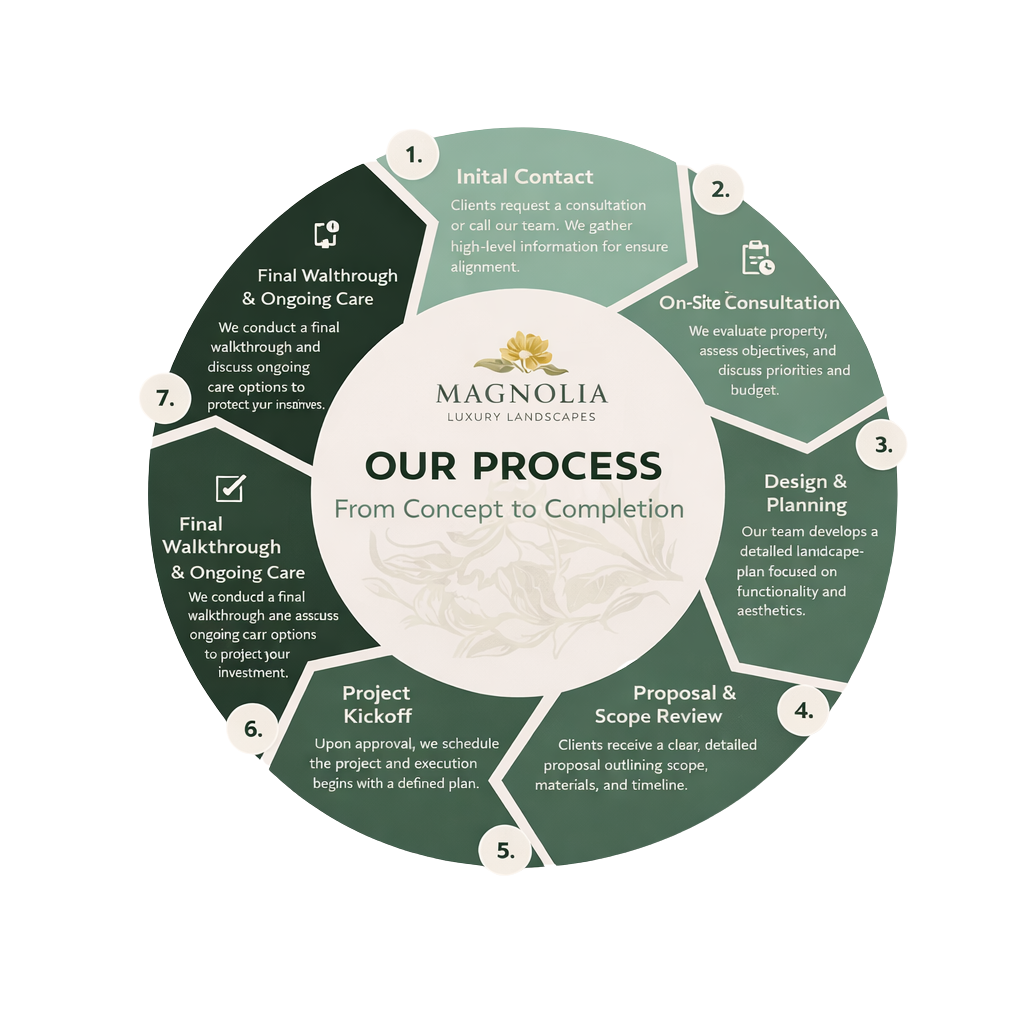 Our landscape maintenance clients experience Magnolia’s five-star standard — defined by clear communication, transparent proposals, straightforward payment plans, and proactive care for the details that matter most. Our process is designed to simplify everything, so achieving the landscape you want feels seamless and stress-free. No guesswork. No delays. No surprises — just dependable results delivered with precision.